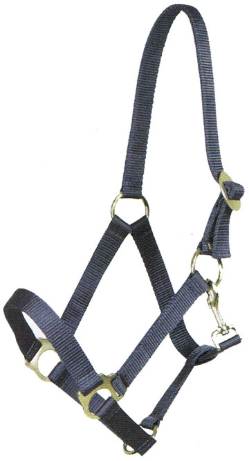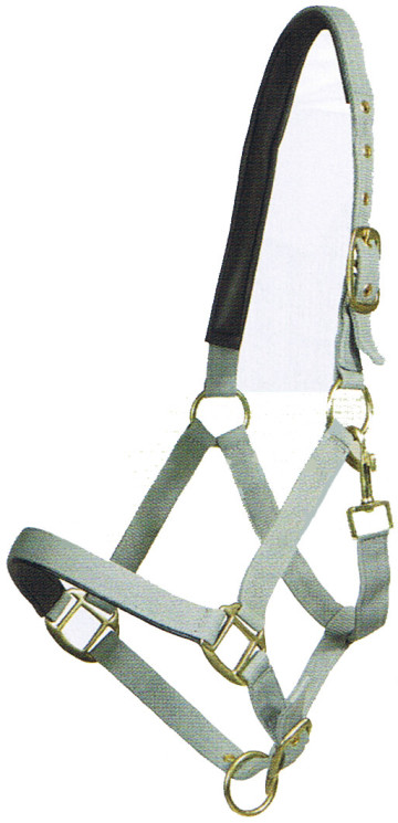 Unterlegtes, zweifach verstellbares Nylonhalfter mit Messingbeschlägen.